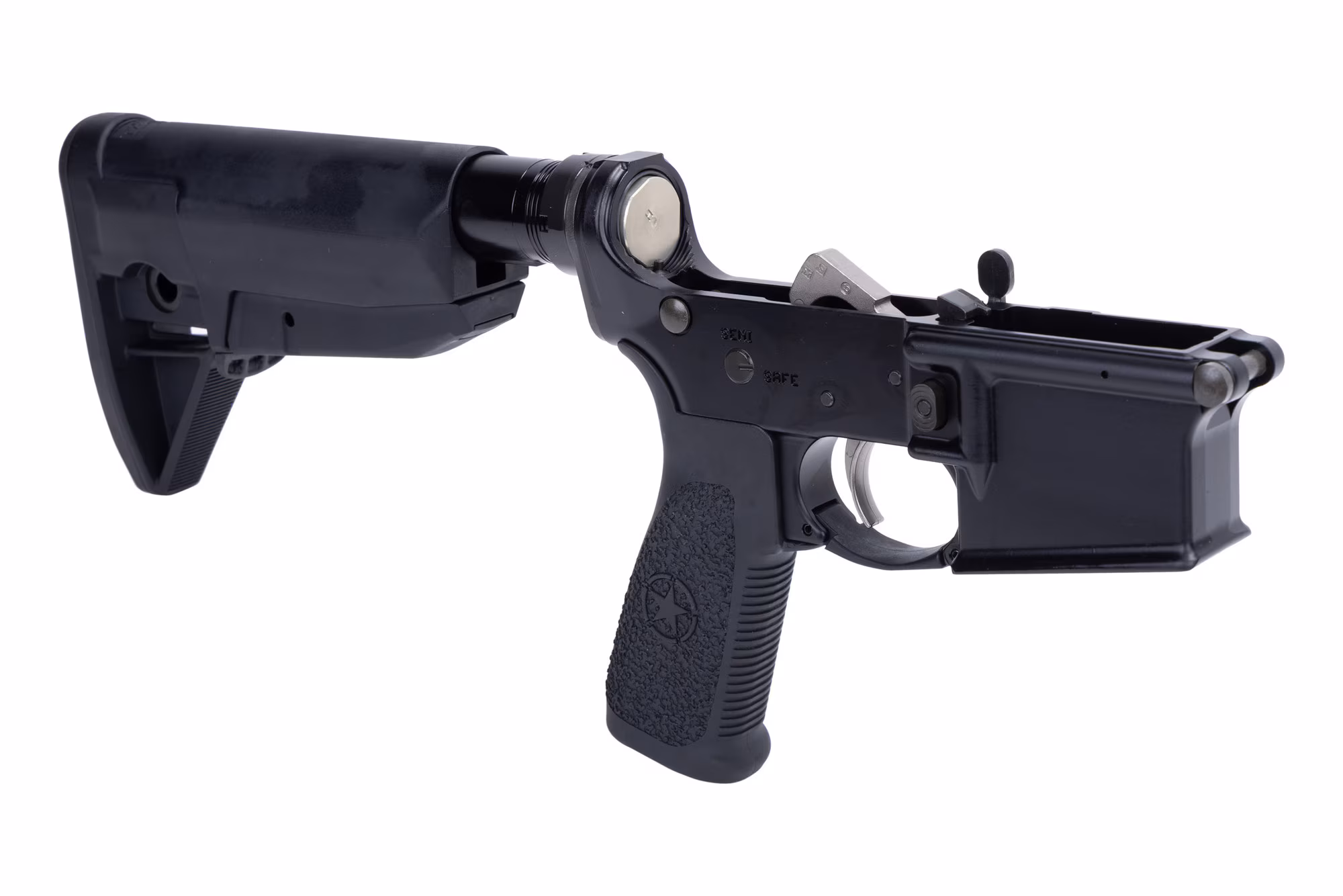 The Bravo Company Manufacturing Complete AR-15 Lower Receiver is fully assembled, including all internals, Gunfighter Pistol Grip and Mod 0 Buttstock. This receiver is machined from a 7075-T6 aluminum forging and hardcoat anodized per MIL-A-8625F, Type III, Class 2.